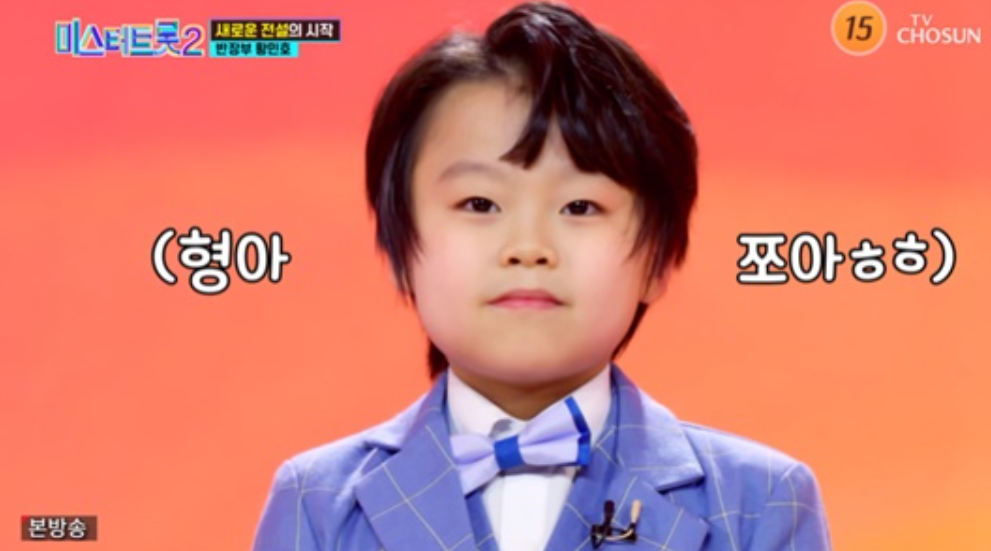 리틀싸이 동생 황민호는 2013년 10월 22일생으로 현재 초등학생입니다. 미스터트롯 예선전에서 '님이여'를 부르며 올하트로 본선에 진출하고 예선전 '선'이 되었습니다.
